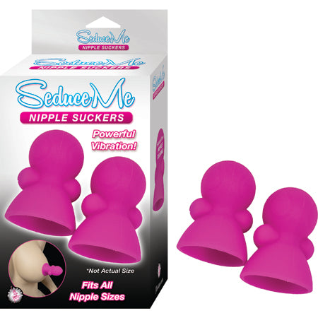 Seduce Me nipple suckers. Fits all nipple sizes.Hands free nipple teasing.Powerful vibration.Squeeze bulb, place over nipple, then release. Waterproof Materials: Silicone bulb with ABS bullet Size: Overall length: 2 inch, Width: 2 inch, Height: 3 inch 4 LR754 batteries included (2 in each nipple sucker) 4 Extra batteries also included.