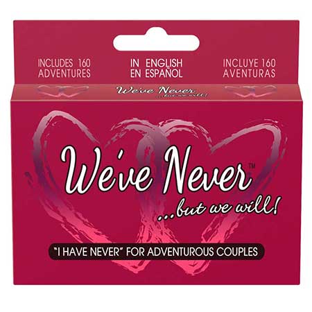 Hours and Weeks of Adult Fun! A couple reads the We've Never cards to each other and celebrates what they have done together. If they have not done the sexual activity on a card, but decide that they would want to do it in the future, they save the card and toast the adventure. Play with your favorite beverages and toast what you have done and what you will do, or simply build up a collection of new sexual encounters for future use.Includes: 40 Location, Location cards; 40 Fun and Games, and Toys, Toys, Toys! Cards; 40 Erotic Edibles and Other Indulgences cards; 40 Fantasy and Role-Play cards; 2 ...but we will! envelopes; 1 spinner and game rules.